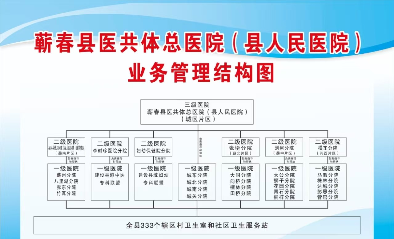 组建以起蕲春县卫健局主导、蕲春县人民医院为主体、其他公立医疗机构为成员的紧密型县域医共体(蕲春县医共体总医院,以下简称县总医院),着力构建“县总医院(县人民医院)+28家医疗单位+333个村卫生室(社区卫生服务站)”的“1+28+333”紧密型县域医共体组织管理模式,实行一体化运行。